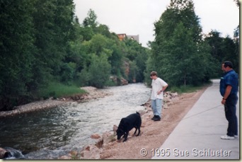 It was early July and the had just opened our campground as the snow had just melted enough to do so. Sadie and Joe took advantage of the snow adjacent to our campsite and played for a while in the “July snow.” We toured the usual sites and saw buffalo and elk. We stopped at a Yellowstone Lake boat launch, boat launches are always interesting. Well, Sadie always liked water and boats and before we knew it she hopped into some stranger’s boat. At least she wasn’t wet . . . yet. Next she ran right into the lake. She didn’t stay in long as it was only 42 degrees according to the guy with the boat (according to his depth finder).